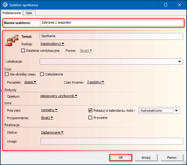 Słownik Szablony działań w programach InsERT GT przechowuje szablony, z których użytkownik może korzystać np. podczas dodawania do systemu nowych działań każdego typu. W celu powielenia szablonu działania typu spotkanie należy: