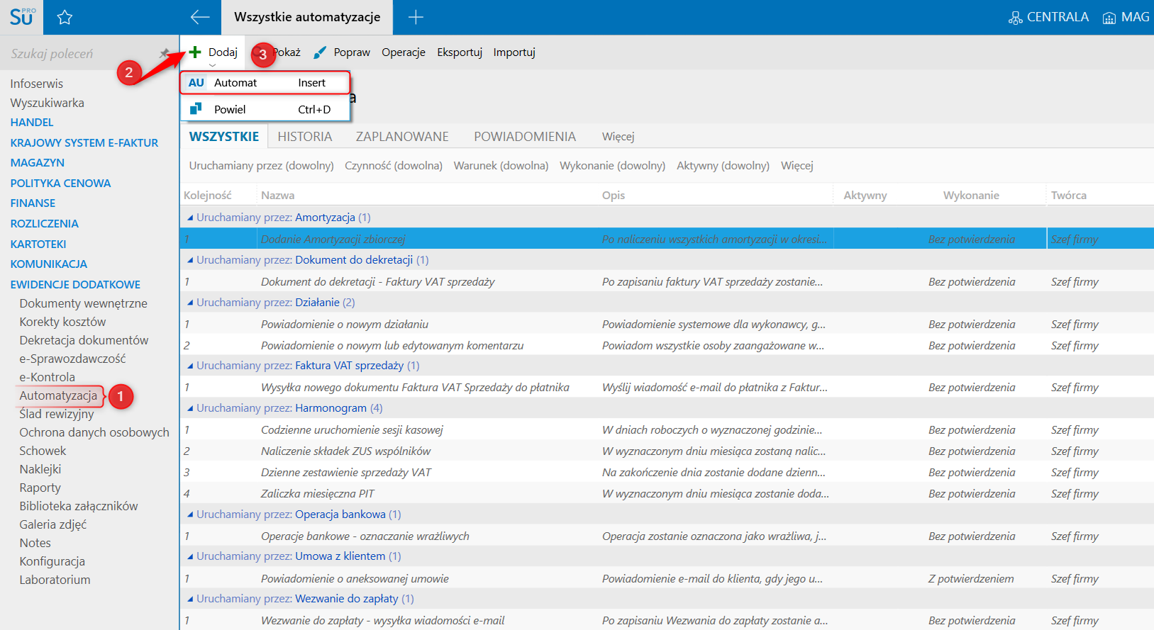 Moduł Automatyzacja pomaga w zautomatyzowaniu procesów w firmie. Użytkownik może np. zaplanować, aby w ślad za każdym utworzonym dokumentem handlowym, ofertą, umową lub zleceniem serwisowym powstawało działanie – był wysyłany e-mail lub wiadomość SMS. Automaty domyślnie są pogrupowane według typów obiektów.