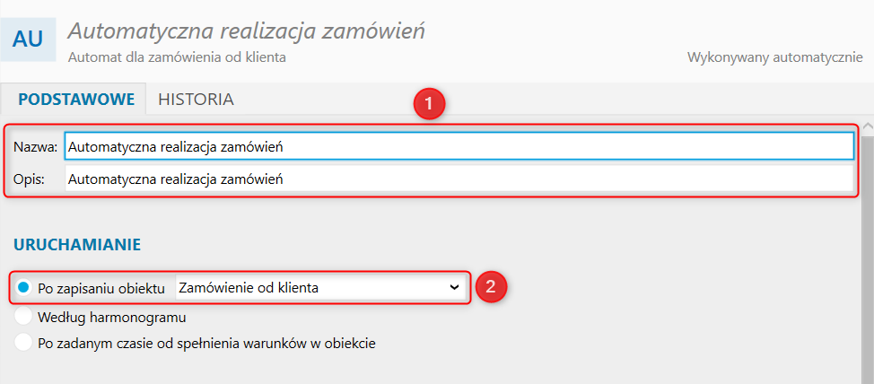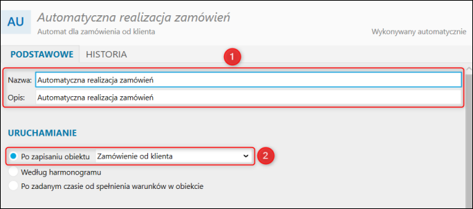 2. Nadać nazwę automatu i wprowadzić moment uruchamiania obiektu Po zapisaniu obiektu – Zamówienie od klienta.