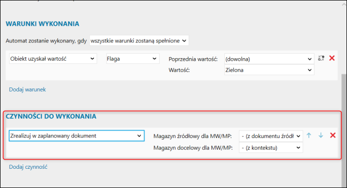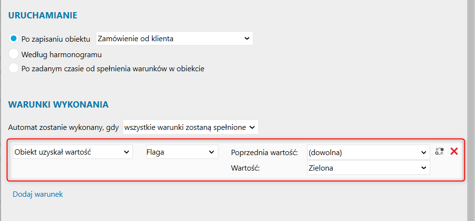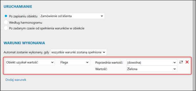 3. W sekcji Warunki wykonania dodać warunek Obiekt uzyskał wartość – Flaga, Poprzednia wartość – (dowolna), Wartość – Zielona,