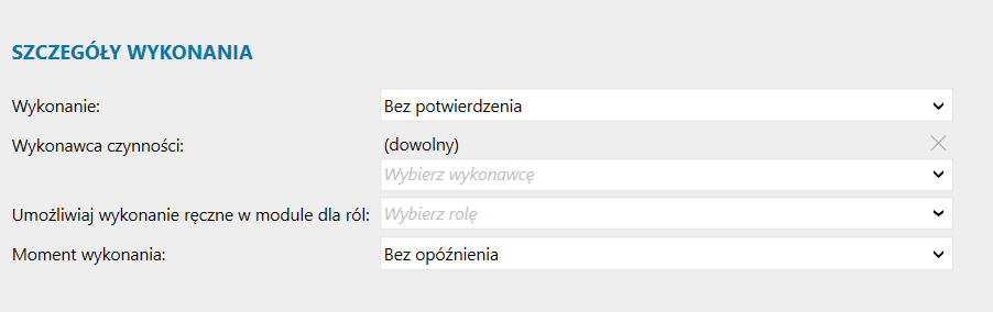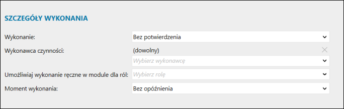 5. W sekcji Szczegóły wykonania wprowadzić ustawienia dotyczące sposobu wykonania, wykonawcy czynności i momentu wykonania automatu. Opcjonalnie umożliwić wykonywanie ręczne w module dla ról. Zapisać automat.