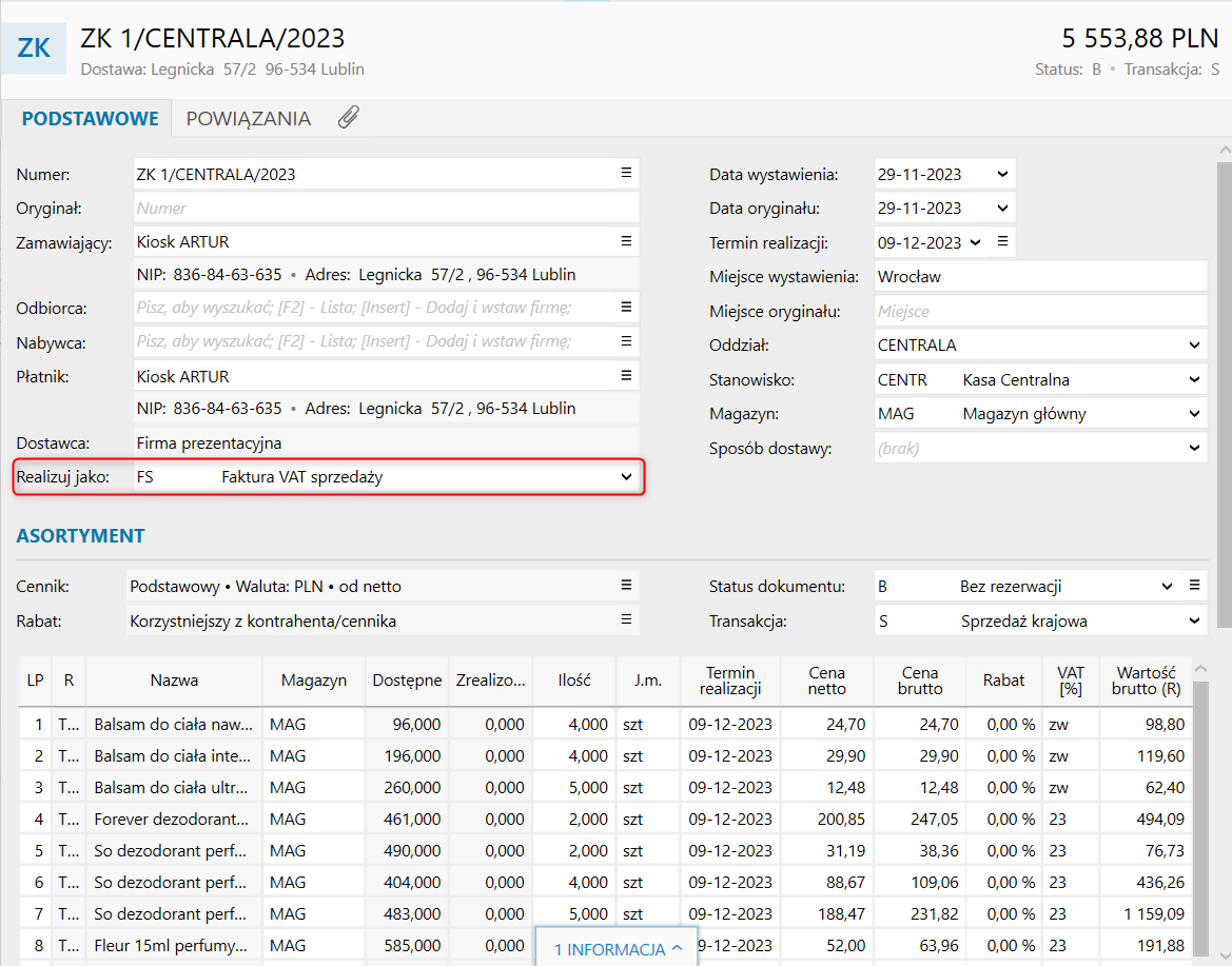 Użytkownik systemu Subiekt nexo ma możliwość wskazania dokumentu, który będzie realizował zamówienie do klienta.