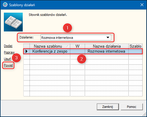2. W oknie Szablony działań wybrać Rozmowa internetowa w polu Działanie, zaznaczyć szablon, który ma zostać powielony i kliknąć opcję Powiel.
