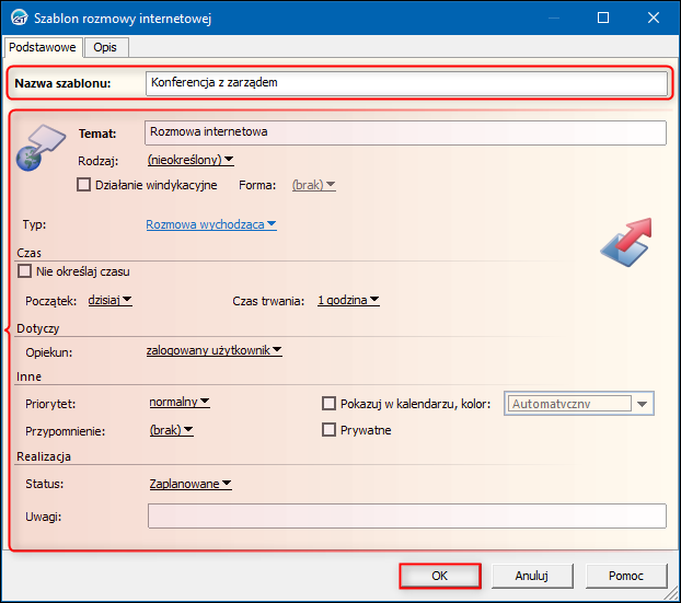 ​Słownik Szablony działań w programach InsERT GT przechowuje szablony​, z których użytkownik może korzystać np. podczas dodawania do systemu nowych działań każdego typu. W celu powielenia szablonu działania typu rozmowa internetowa należy: