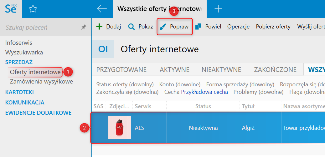 1. Przejść do modułu Oferty internetowe, zaznaczyć pozycję na liście, a następnie kliknąć Popraw.