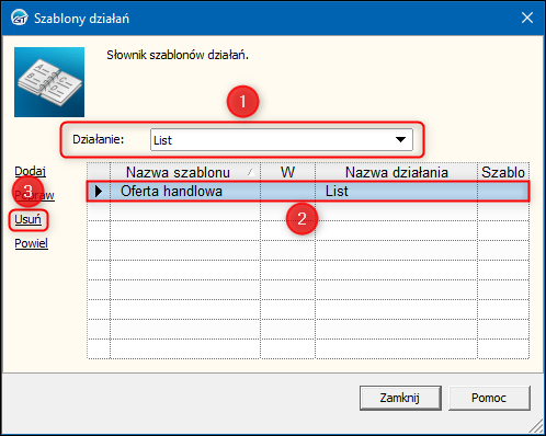 2. W oknie Szablony działań wybrać List w polu Działanie, zaznaczyć szablon, który ma zostać usunięty i kliknąć opcję Usuń.