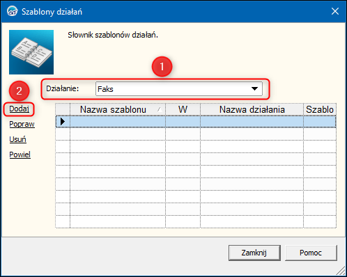 2. W oknie Szablony działań wybrać Faks w polu Działanie i kliknąć opcję Dodaj.