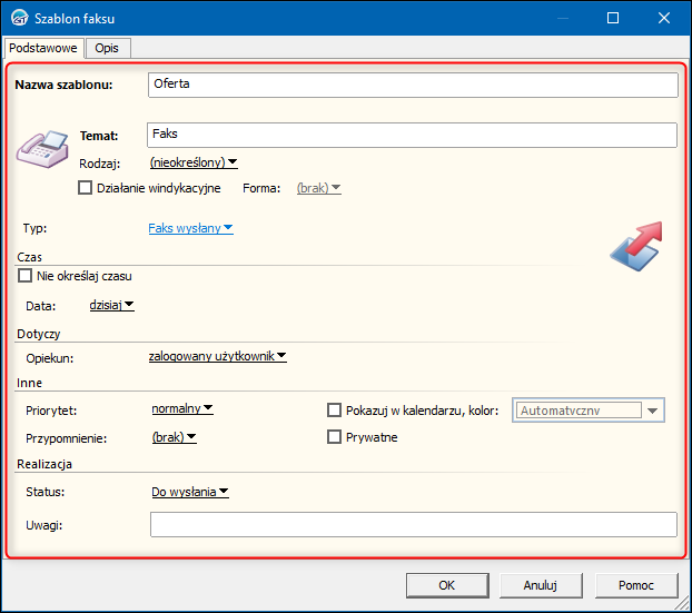 Słownik Szablony działań w programach InsERT GT przechowuje szablony, z których użytkownik może korzystać np. podczas dodawania do systemu nowych działań każdego typu. W celu dodania szablonu działania typu faks należy:
