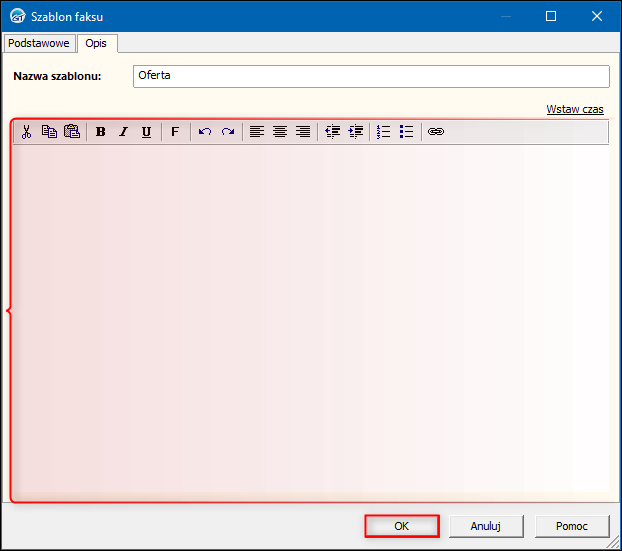 4. Na zakładce Opis można uzupełnić treść potrzebnymi informacjami. Szablon zapisać przyciskiem OK.