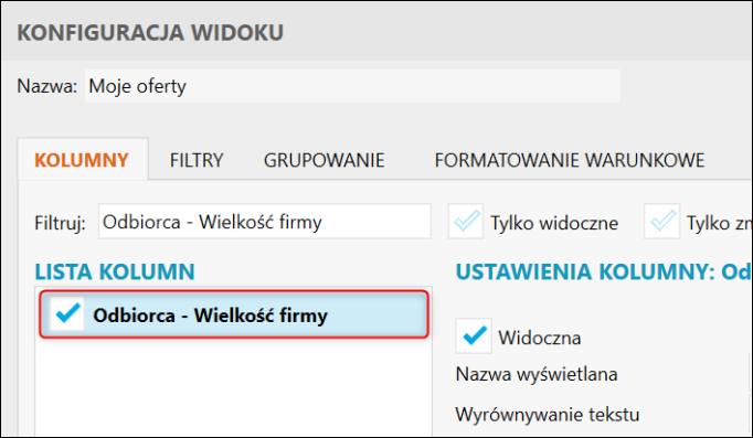Gestor nexo – Jak do widoku Ofert dodać kolumnę Odbiorca – Wielkość firmy?