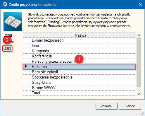 Źródła pozyskania kontrahenta w programach InsERT GT służą przede wszystkim do filtrowania list oraz mogą stać się kryterium wyboru w zestawieniach. W celu usunięcia źródła pozyskania kontrahenta należy: