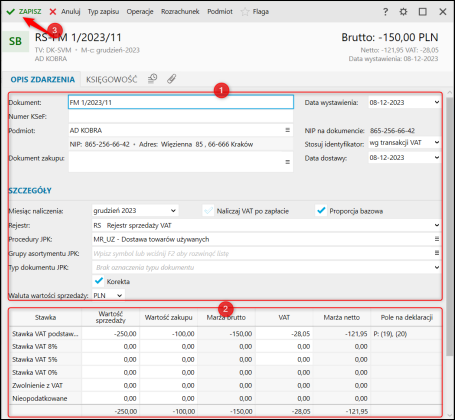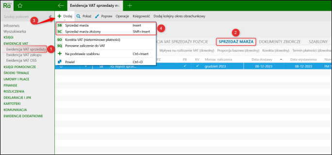 1. Przejść do modułu Ewidencja VAT sprzedaży – Sprzedaż marża. Dodać lub poprawić istniejący zapis.