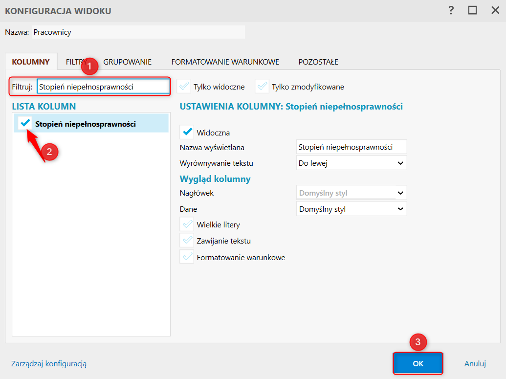 Gratyfikant nexo – Jak do widoku Pracownicy dodać informację o stopniu niepełnosprawności pracownika?