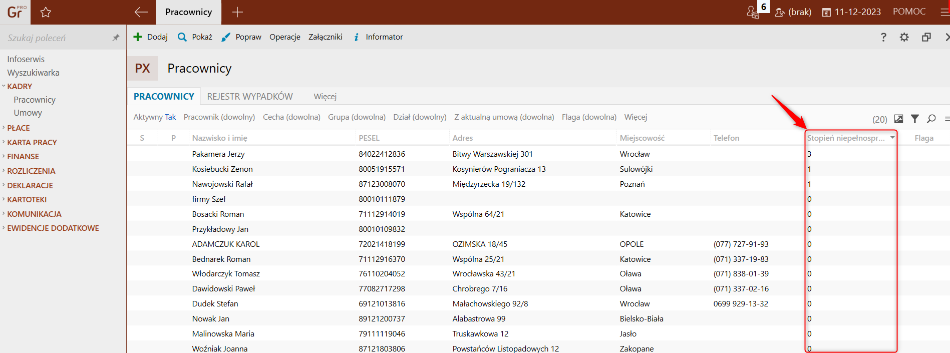 Moduł Pracownicy pozwala ewidencjonować dane personalne osób zatrudnionych na umowę o pracę oraz zleceniobiorców, z którymi są zawarte umowy cywilnoprawne (umowy zlecenia, umowy o dzieło, kontrakty menadżerskie). Aby w widoku Pracownicy wyświetlić kolumnę z informacją o stopniu niepełnosprawności pracownika, należy: