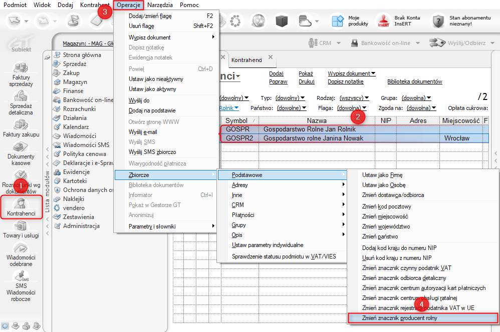 1. Wejść do modułu Kontrahenci, zaznaczyć kontrahentów, którym zostanie włączone naliczanie kwot na Fundusz Ochrony Rolnictwa i z górnego menu programu wybrać Operacje – Zbiorcze – Podstawowe – Zmień znacznik producent rolny.