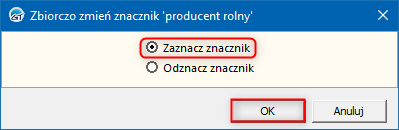 2. W oknie Zbiorczo zmień znacznik 'producent rolny' wybrać opcję Zaznacz znacznik. Wybór zatwierdzić przyciskiem OK.