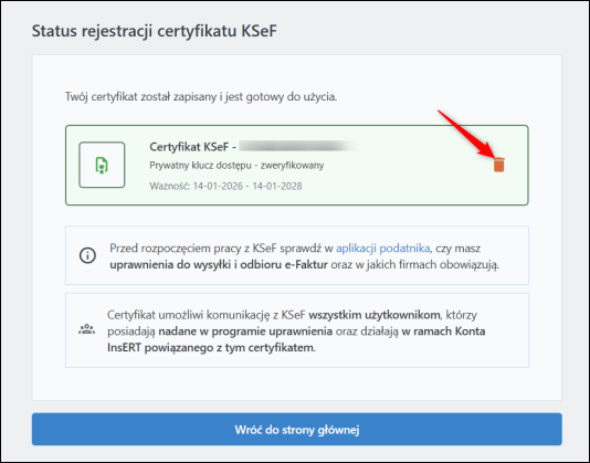 4. Kliknąć ikonę kosza przy Certyfikacie KSeF.