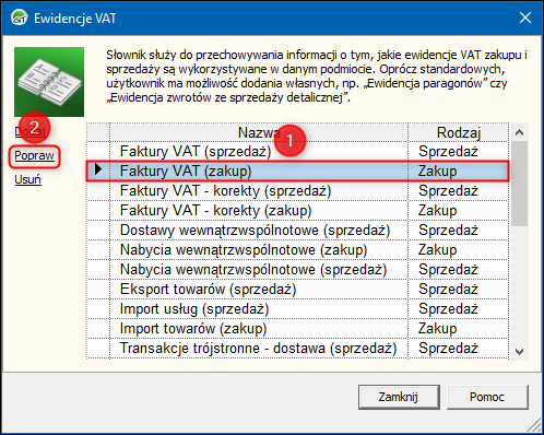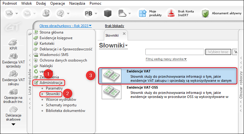 1. Z listy modułów wybrać Administracja – Słowniki, a z listy słowników Ewidencje VAT.