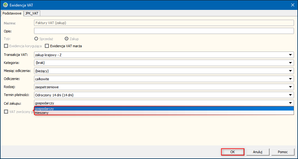 3. Wybrać domyślny Cel zakupu. Zmiany zapisać przyciskiem OK.