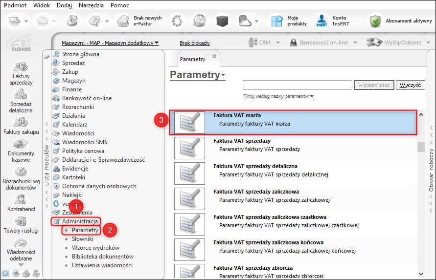 1. Z listy modułów wybrać Administracja – Parametry, a z listy parametrów Faktura VAT marża.