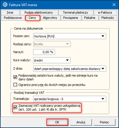 2. W oknie, które się wyświetli przejść na zakładkę Ceny i zaznaczyć opcję Zaznaczaj VAT rozliczany przez usługobiorcę (art. 100 ust. 1 pkt 4) dla tr. SPTK. Zmiany zapisać przyciskiem OK.
