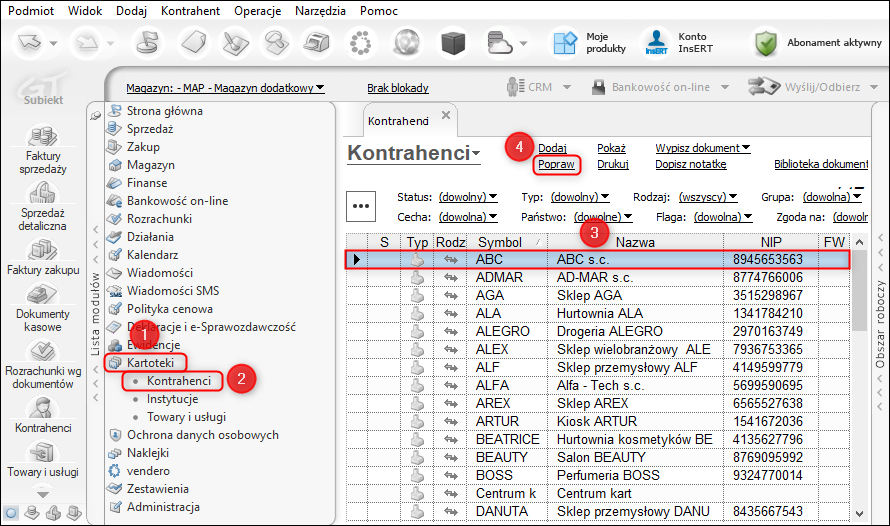 1. Z listy modułów wybrać Kartoteki – Kontrahenci, zaznaczyć kontrahenta, któremu zostanie ustawiona domyślna transakcja VAT dla faktur wewnętrznych podatku naliczonego i wybrać opcję Popraw.