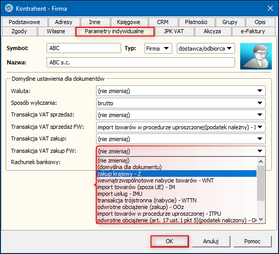 2. Przejść na zakładkę Parametry indywidualne i wybrać domyślną Transakcję VAT zakup FW. Zmiany zapisać przyciskiem OK.