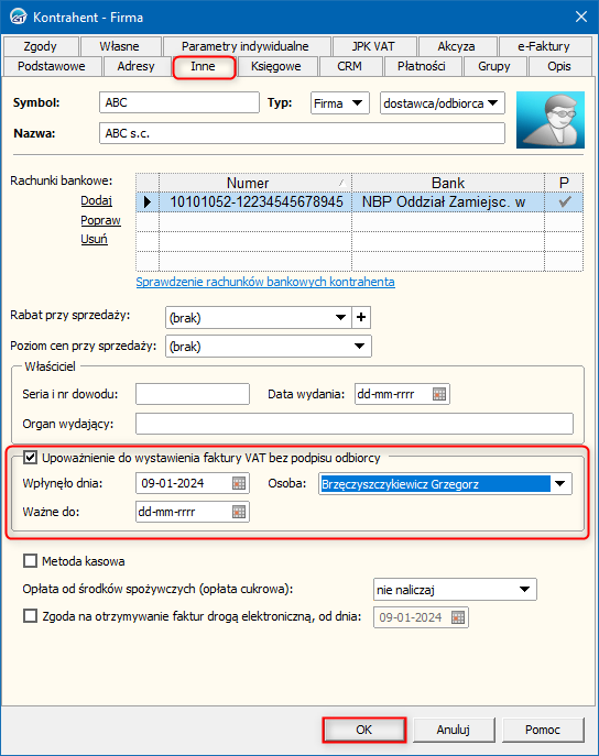 2. Przejść na zakładkę Inne i zaznaczyć Upoważnienie do wystawiania faktury VAT bez podpisu odbiorcy. Dodatkowo można określić Datę wpłynięcia, osobę wydającą i termin ważności. Zmiany zapisać przyciskiem OK.