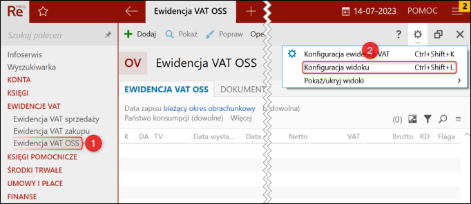 1. Przejść na zakładkę Ewidencja VAT OSS, rozwinąć menu koła zębatego w górnym menu i wybrać Konfiguracja widoku.