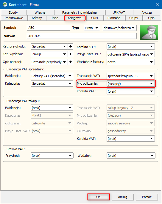 2. Przejść na zakładkę Księgowe i wybrać domyślny M-c odliczenia w sekcji Ewidencja VAT sprzedaży. Zmiany zapisać przyciskiem OK.