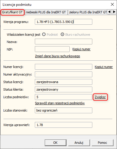 Podstawowa licencja Gratyfikanta GT umożliwia pracę na 5 czynnych podmiotach. W przypadku konieczności obsługi większej liczby podmiotów, należy wykupić rozszerzenie o kolejnych 5 podmiotów