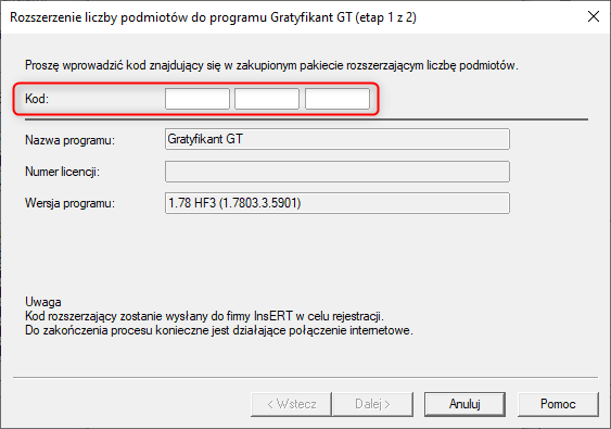 Po dokonaniu internetowej rejestracji kodów rozszerzających liczbę podmiotów – opcja dostępna jest tylko na podmiotach z zarejestrowaną licencją główną na biuro rachunkowe, a w tym celu należy przejść do okna Licencje podmiotu (górne menu Pomoc – Zarządzanie licencjami).