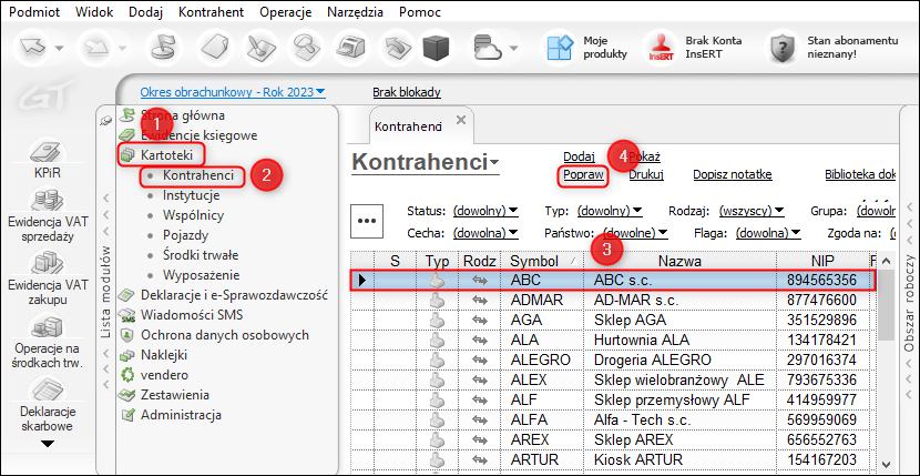 1. Z listy modułów wybrać Kartoteki – Kontrahencizaznaczyć kontrahenta, któremu zostanie ustawiony domyślny przypadek szczególny zapisów ewidencji VAT zakupu i kliknąć opcję Popraw.