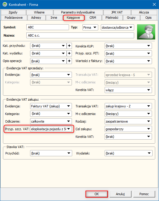 2. Przejść na zakładkę Księgowe i wybrać domyślny Przyp. szcz. VAT w sekcji Ewidencja VAT zakupu. Zmiany zapisać przyciskiem OK.