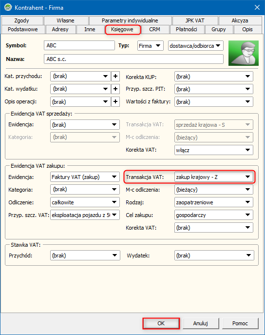 2. Przejść na zakładkę Księgowe i wybrać domyślną Transakcję VAT w sekcji Ewidencja VAT zakupu. Zmiany zapisać przyciskiem OK.