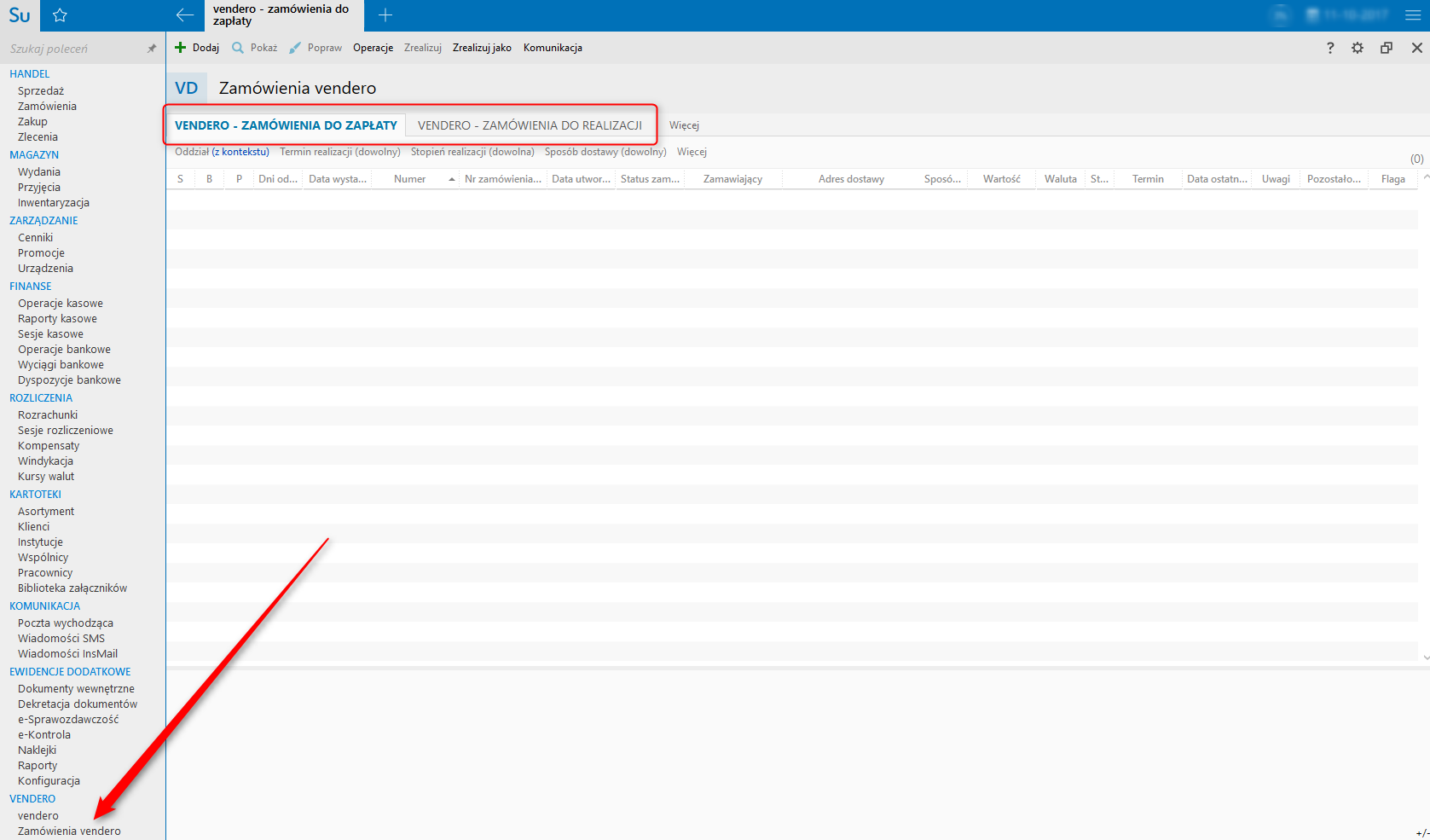 W programie Subiekt nexo lokalizacja modułu zamówień vendero zależy od wersji. W wersji nexo 16 i wcześniejszych moduł ten znajduje się w vendero - Zamówienia vendero (mnemonik VD), gdzie widoczne będą zakładki vendero - Zamówienia do zapłaty oraz vendero - Zamówienia do realizacji.