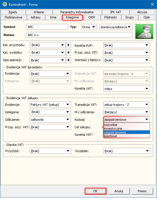 Rachmistrz i Rewizor GT – Jak ustawić kontrahentowi domyślny rodzaj zapisów ewidencji VAT zakupu?