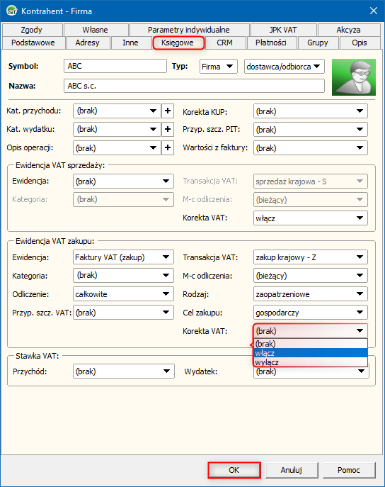Rachmistrz i Rewizor GT – Jak ustawić kontrahentowi domyślne korygowanie VAT na zapisach ewidencji VAT zakupu?