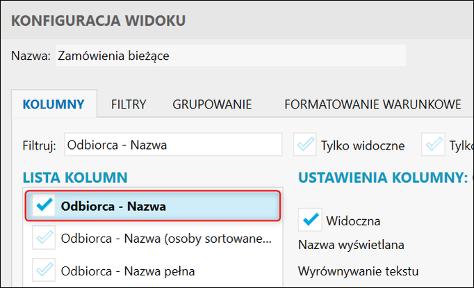 2. W polu Filtruj wpisać Odbiorca – Nazwa, zaznaczyć wyszukaną kolumnę na liście poniżej i zatwierdzić przyciskiem OK.