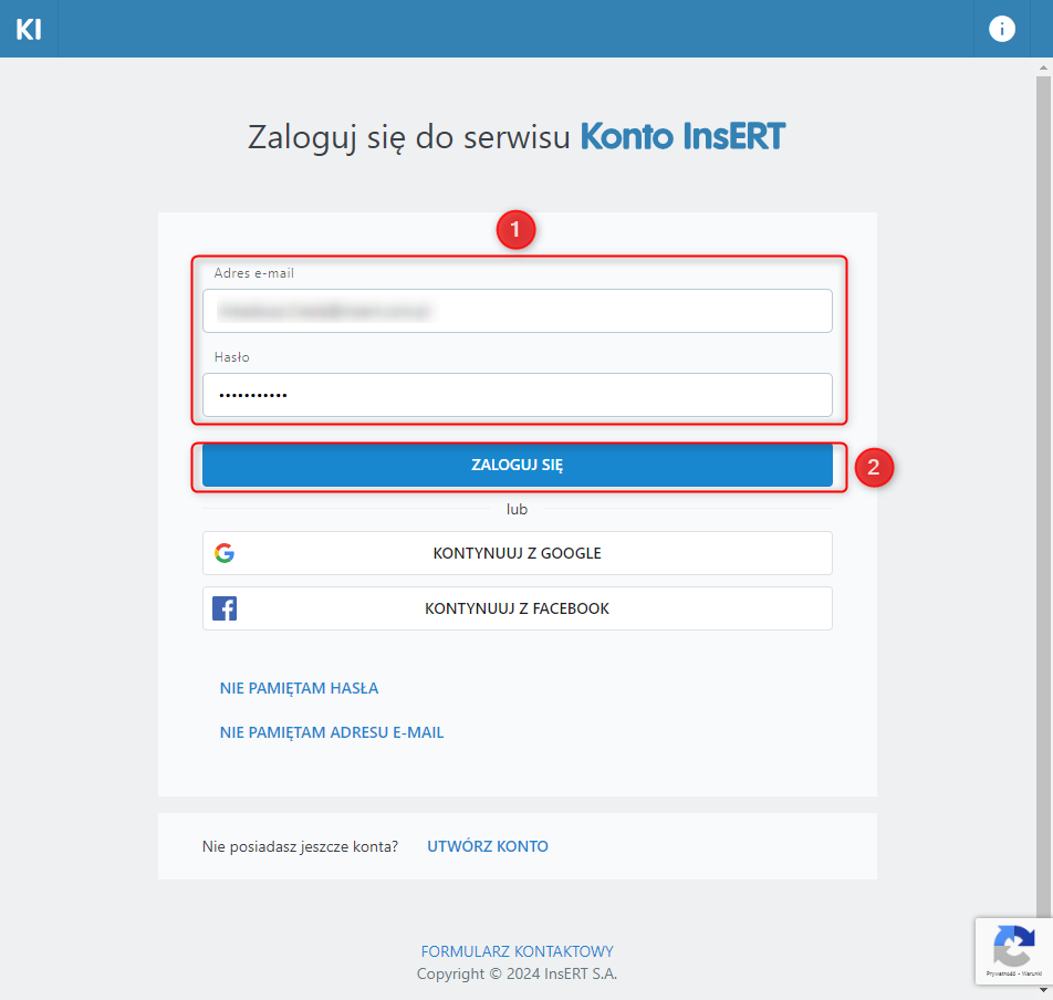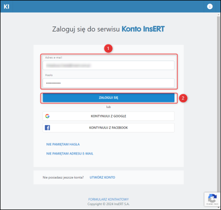 1. Zalogować się do Konta InsERT wpisując adres e-mail i hasło.