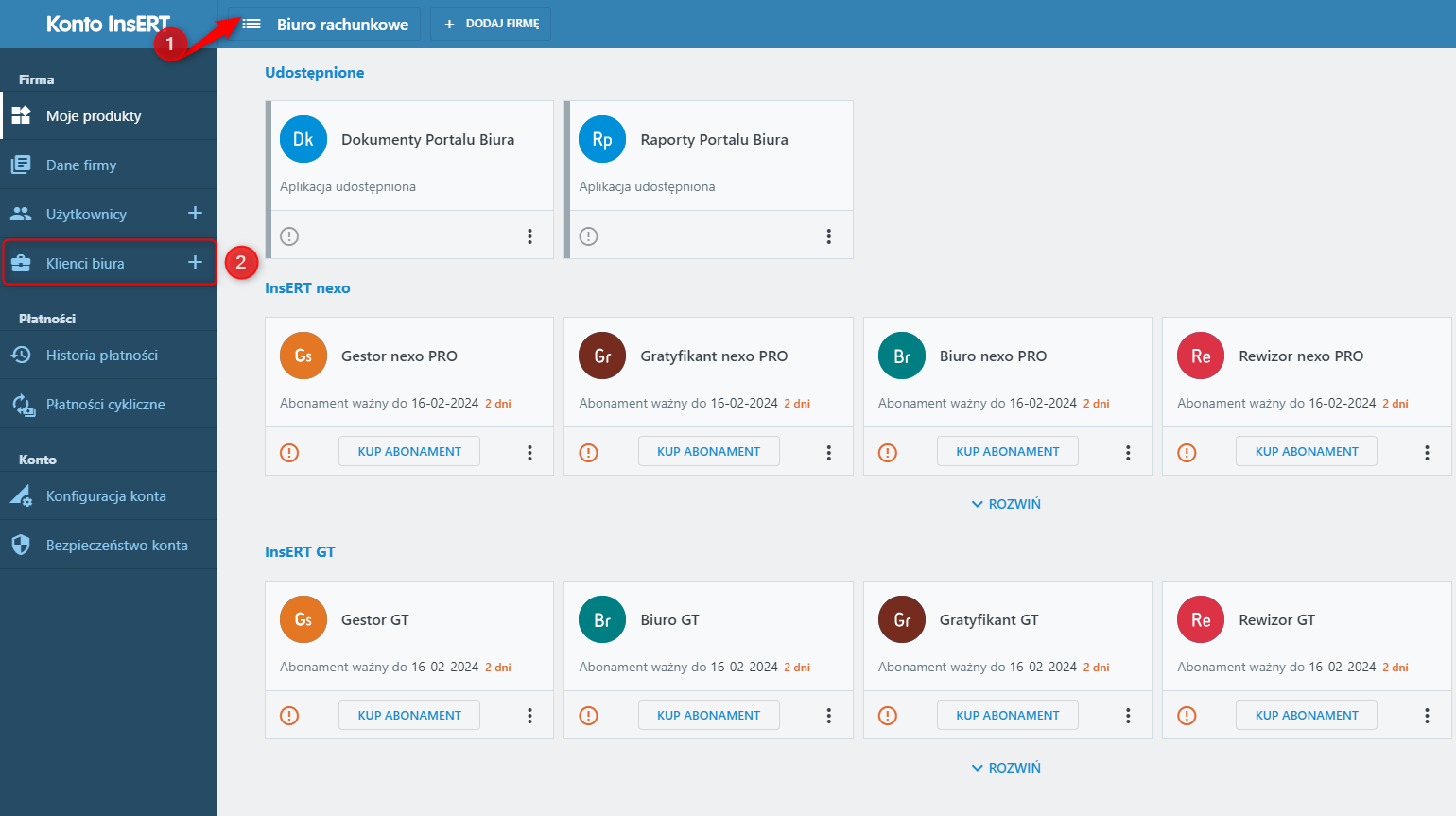 2. Wybrać firmę biura rachunkowego i kliknąć Klienci biura.