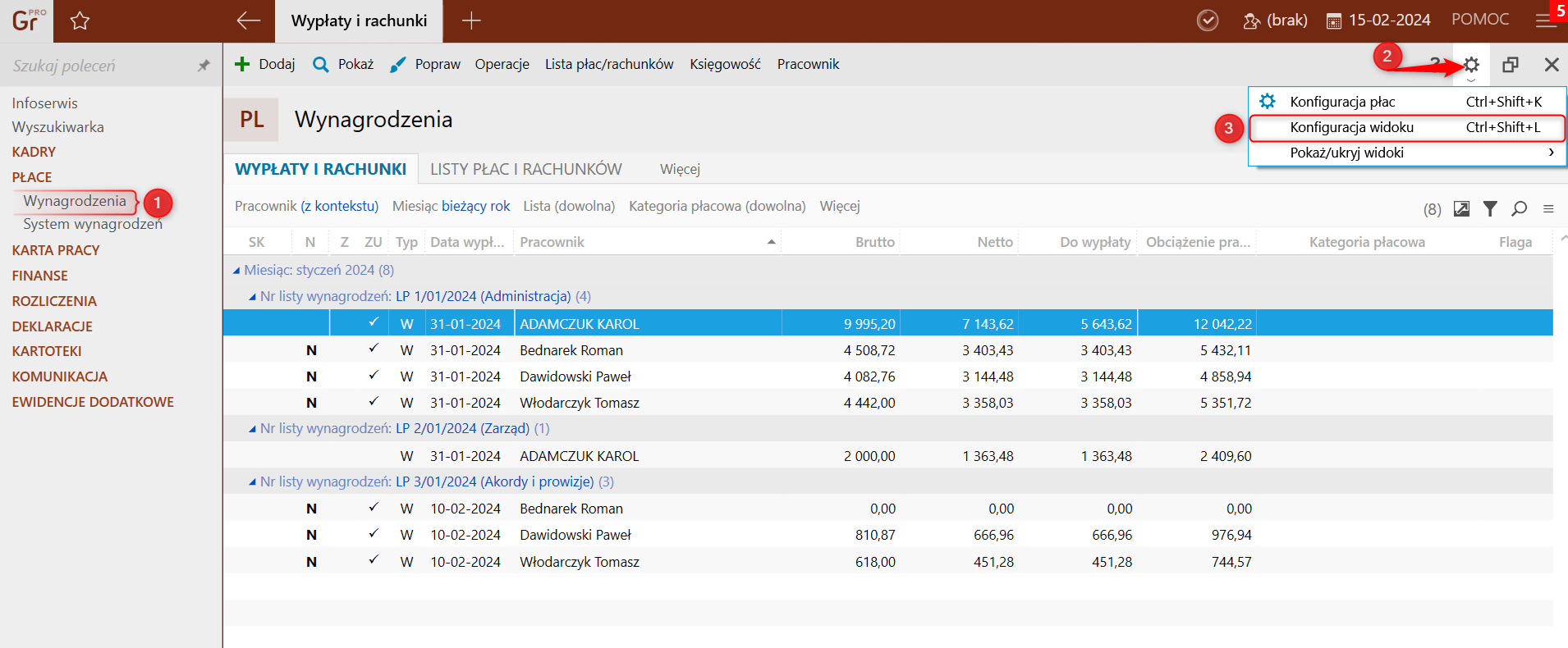 1. Przejść do modułu Wynagrodzenia – Wypłaty i rachunki. Następnie kliknąć prawy górny róg programu ikonę „koła zębatego” i wybrać Konfiguracja widoku.