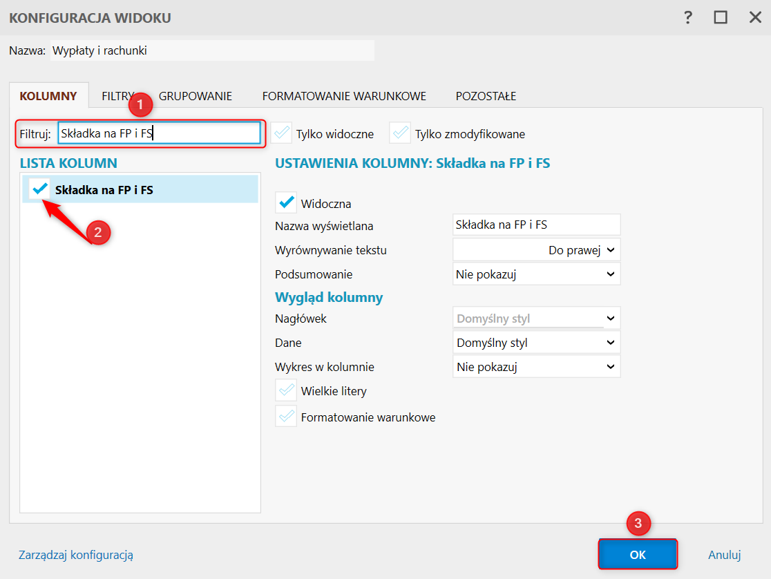 2. Odszukać i zaznaczyć Składka na FP i FS. Kliknąć OK.