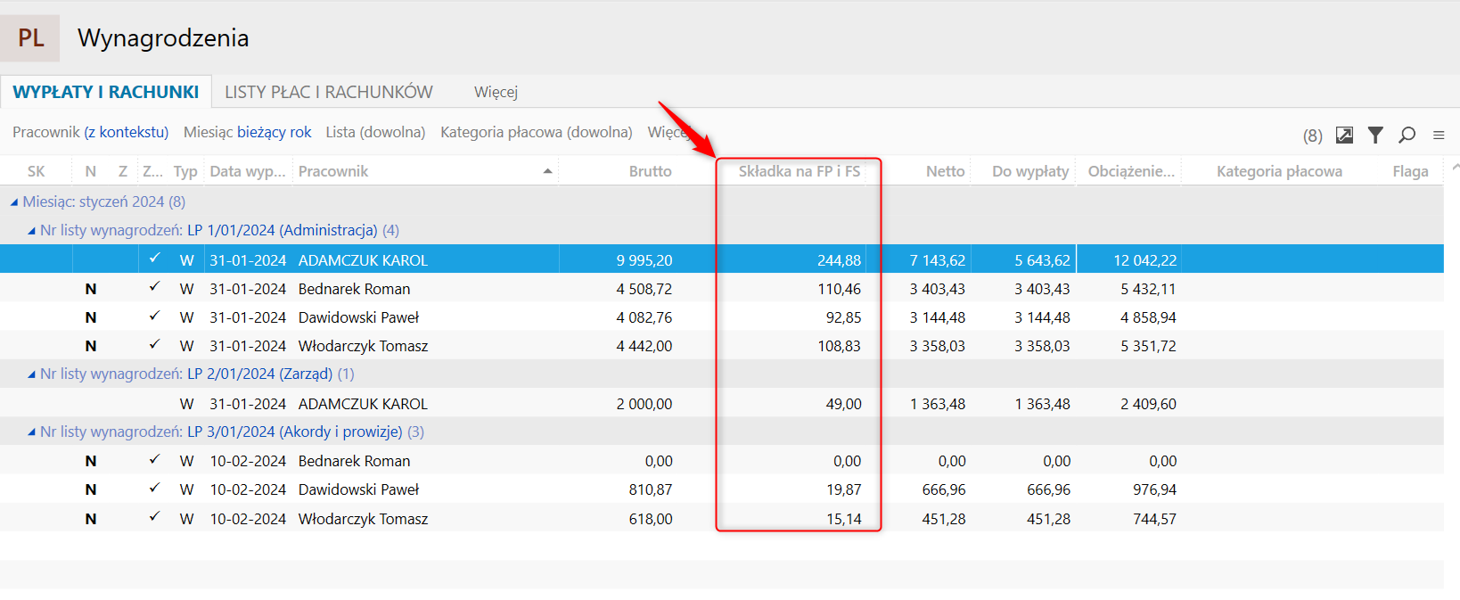 Widok Wypłaty i rachunki prezentuje wszystkie naliczone wynagrodzenia. Podstawowy widok prezentuje wynagrodzenia pogrupowane według miesięcy oraz list płac. Gratyfikant nexo umożliwia dodanie do widoku dodatkowych kolumn. Aby dodać informację o wysokości składki na FP (Fundusz Pracy) i FS (Fundusz Solidarnościowy) należy: