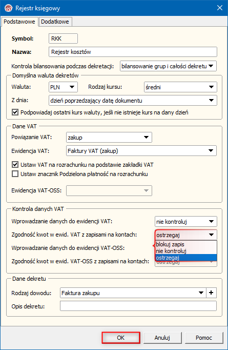 3. W sekcji Kontrola danych VAT, w polu Zgodność kwot w ewid. VAT z zapisami na kontach wybrać jedną z dostępnych opcji. Zmiany zapisać przyciskiem OK.