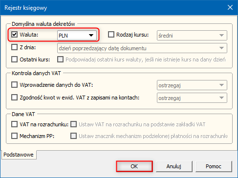 3. W sekcji Domyślna waluta dekretów zaznaczyć opcję Waluta i wybrać z listy domyślną wartość. Operację zbiorczą zatwierdzić przyciskiem OK.