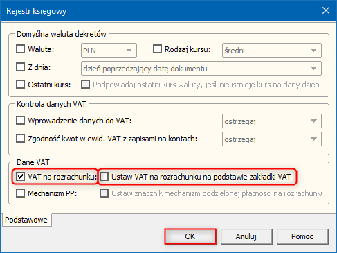 3. Zaznaczyć w sekcji Dane VAT zaznaczyć opcję VAT na rozrachunku a opcję Ustaw VAT na rozrachunku na postawie zakładki VAT zostawić wyłączoną. Zmiany zapisać przyciskiem OK.
