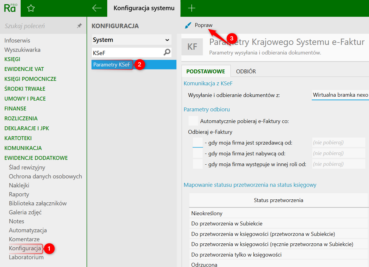 1. Przejść do modułu Konfiguracja – Parametry KSeF i kliknąć Popraw.