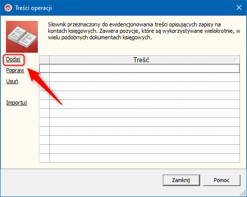 ​Słownik Treści operacji w programie Rewizor GT przeznaczony jest do ewidencjonowania treści opisujących zapisy na kontach księgowych. Zawiera pozycje, które są wykorzystywane wielokrotnie, w wielu podobnych dokumentach księgowych. Program umożliwia dwie możliwości wprowadzania treści w dekretach: ręcznie bez wyboru ze słownika, lub wybierając pozycję ze słownika (Klawisz F2 w polu Treść). W celu dodania nowej treści operacji należy: