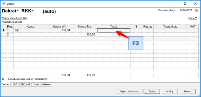 4. Tak wprowadzone treści będą możliwe do wykorzystania podczas dekretacji. W tym celu należy w polu Treść pozycji dekretu wcisnąć przycisk F2 na klawiaturze i wybrać odpowiednią treść.